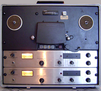 | アンペックスAG440は、Cシリーズまで生産されるが、これはAG440Bの一番有名なモデルで、音に関しては天下一です。走行系に問題があり、Cシリーズでは相当改善されたが、テープテンションのバランスが悪いのはあまり改善されなかった、Bまでは特に10インチテープの最初と最後のスピードが変わってしまう為、テープ全体では2割位使えない場所が発生する事がありました。これはテンションを弱めればスピードの誤差は改善できますが、ヘッドタッチが出ないと特性が大変悪くなる。又、右の画像にある7号テープの場合、初めて操作する人はワカメにしてしまう可能性が大変大きい。 尚、マルチトラックタイプではAG440の8ch仕様までとMM800の8chやMM1000はこのアンプケースもそのまま使われた為、MM1000は大変大きなマシーンになりました。後に続くMM1100やMM1200は回路はほぼそのままですが、このアンプケースを捨てた為、小型化に成功してます。 | ![]() |